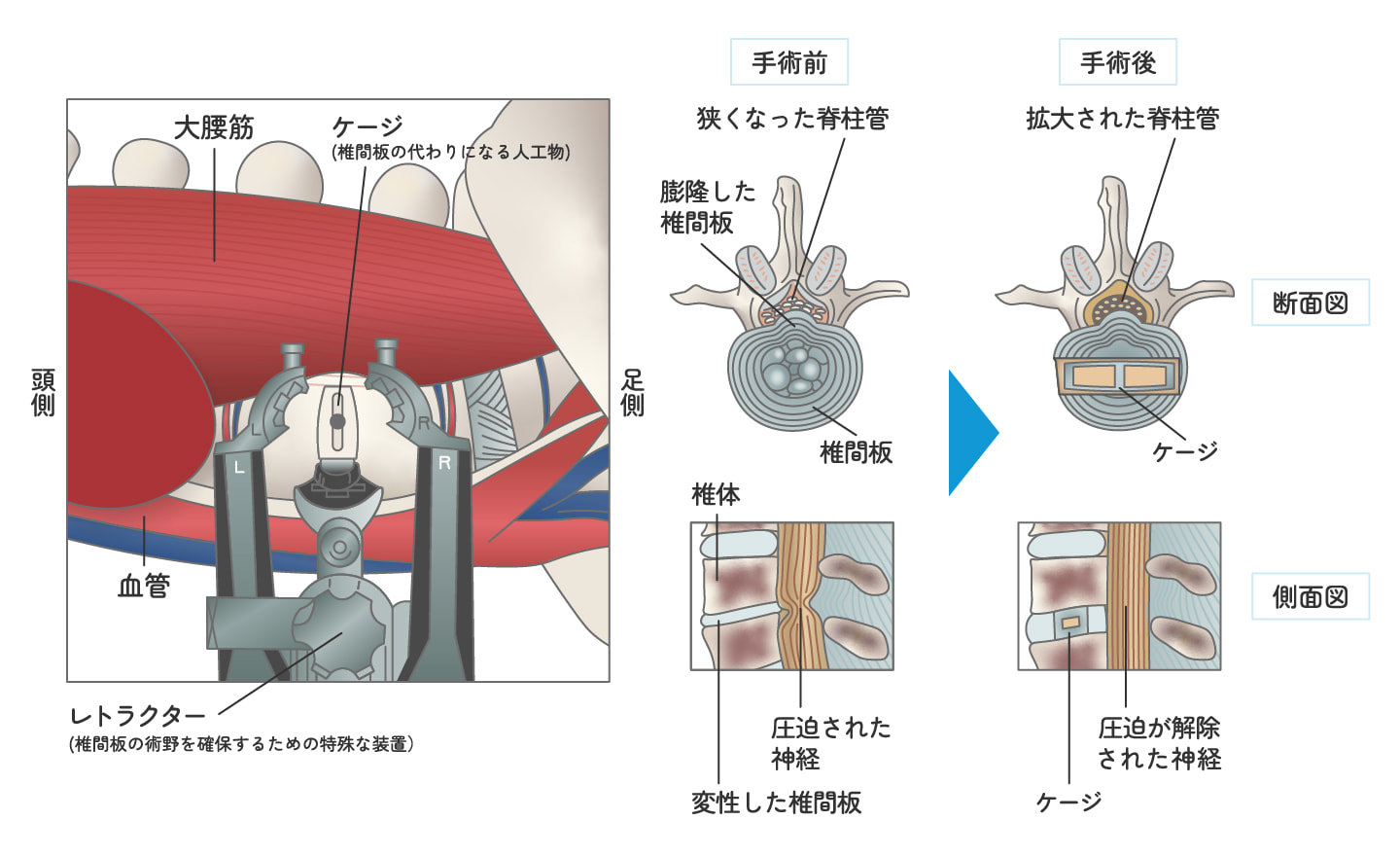 挿入して固定する手術です。従来の背中から行う手術に比べて、筋肉への負担が少なく、大きなケージを挿入できるため、安定した固定が得られます。背中側の筋肉や神経に触れないため、術後の痛みが軽減できます。