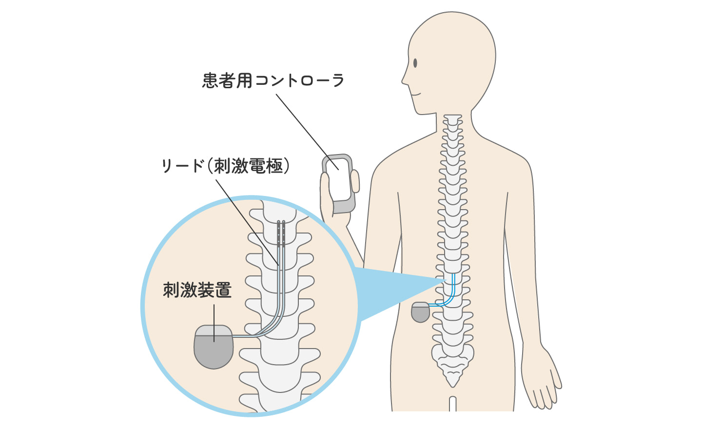 脊髄に微弱な電気を流すことによって痛みをやわらげる治療法です。脊髄に電気刺激を与えて、痛みを引き起こしている神経の異常な興奮を調整することで、脳に痛みの信号を伝わりにくくさせて鎮痛効果が発揮されると考えられています。試験的に刺激を行い効果を確かめます(トライアル)。効果がある場合は刺激装置などの機器一式を植込みます(本植込み)。