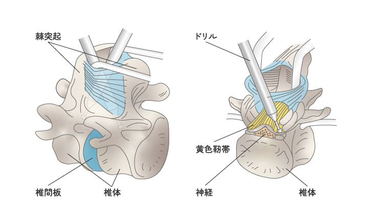 背骨の棘突起の間からアプローチし、神経を圧迫している靭帯や骨などを除去して、神経の通り道である脊柱管を拡大する手術です。