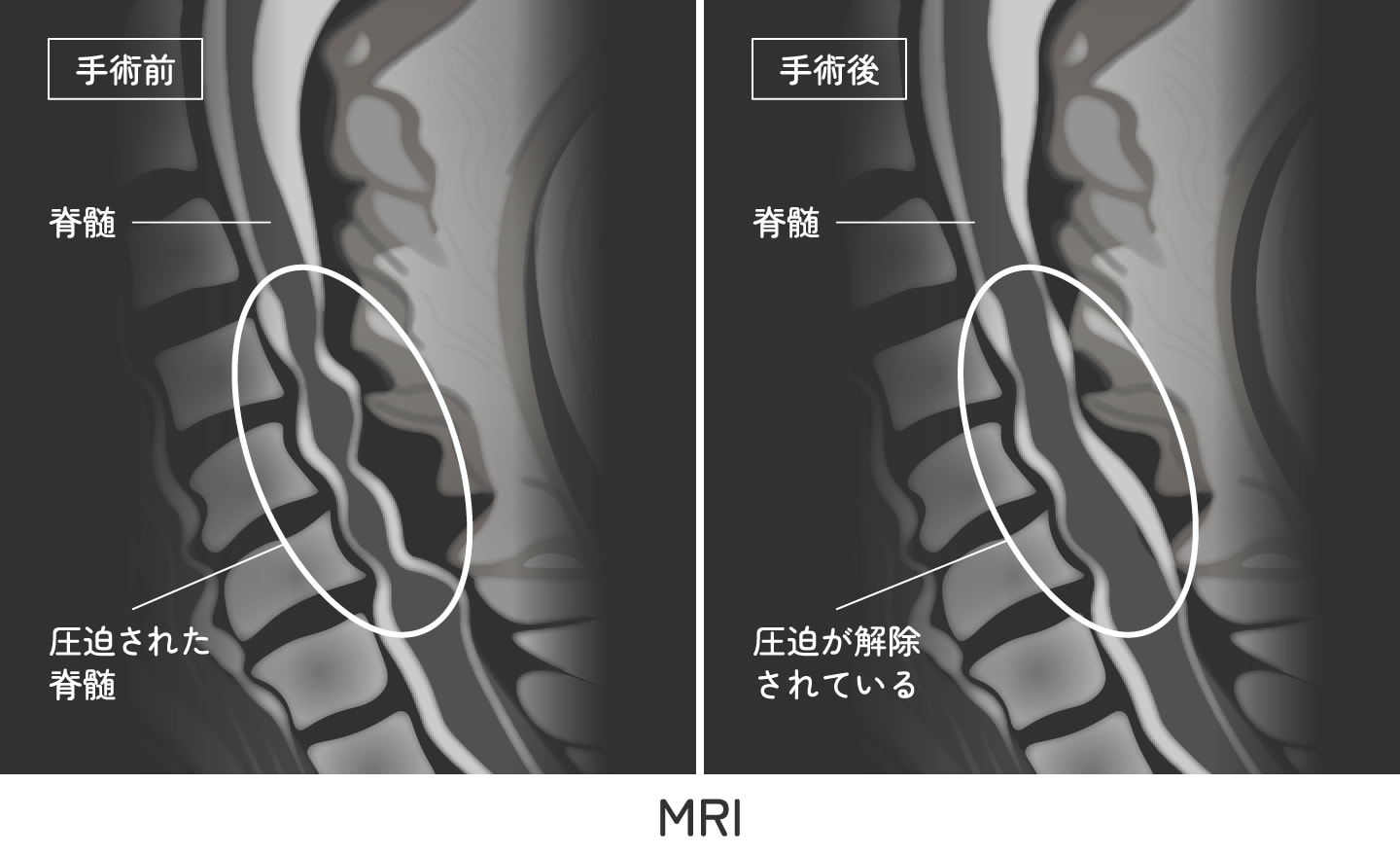 術前に強く圧迫を受けていた脊髄は、術後には良好に