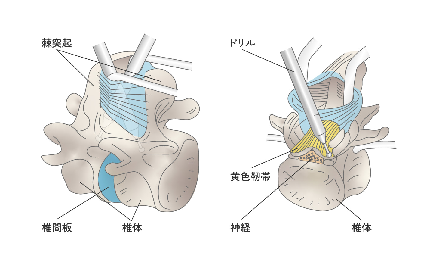 背骨の棘突起の間からアプローチし、神経を圧迫している靭帯や骨などを除去して、神経の通り道である脊柱管を拡大する手術です。
