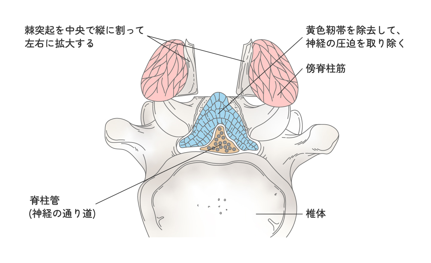 背骨の棘突起を縦に割って左右に開き、神経の圧迫を取り除く手術です。これらの手術は従来の手術よりも筋肉へのダメージが少なく、術後の痛みが軽減され、筋肉の温存が図れるという利点があります。