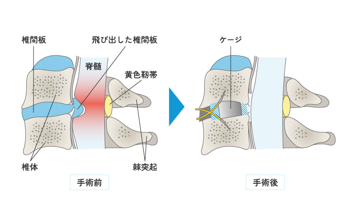 挿入して固定する手術です。従来の背中から行う手術に比べて、筋肉への負担が少なく、大きなケージを挿入できるため、安定した固定が得られます。背中側の筋肉や神経に触れないため、術後の痛みが軽減できます。