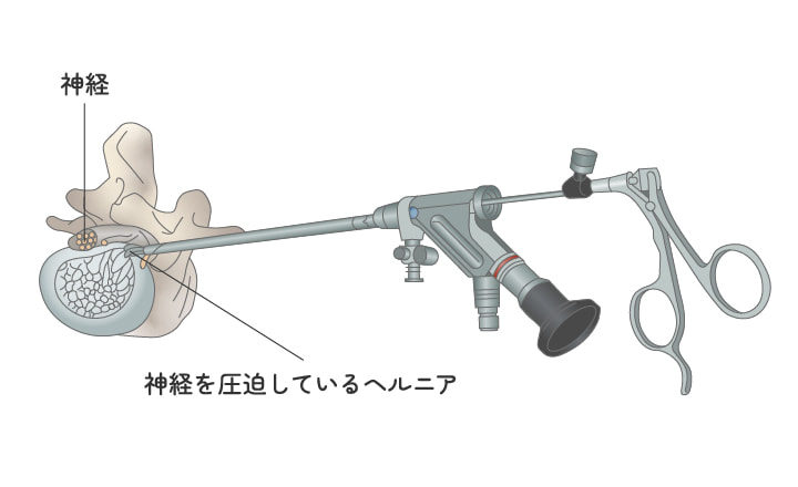 内視鏡を挿入して手術を行います。内視鏡で患部を拡大して見ながら、神経を圧迫しているヘルニアを取り除きます。術後の痛みが少なく、手術後の回復が早いのが